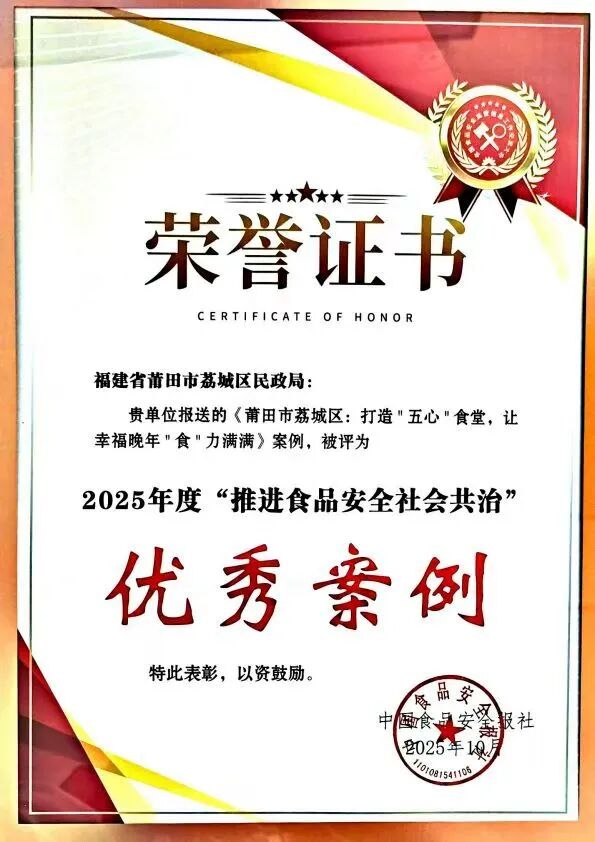 近日,在第十二届全国食品安全监管信息工作交流暨全国食品安全产业高质量发展大会上,由莆田市荔城区民政局报送的《打造“五心”食堂,让幸福晚年“食”力满满》案例获评2025年度“推进食品安全社会共治”优秀案例,为全市唯一、也是全国民政系统唯一的获评案例。