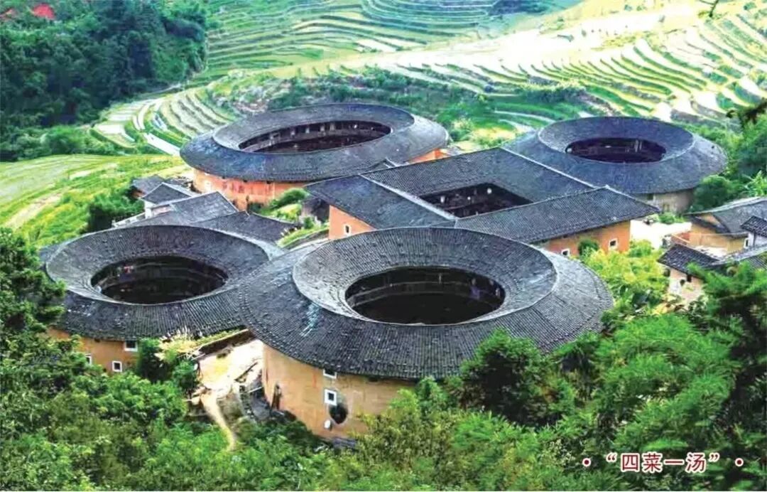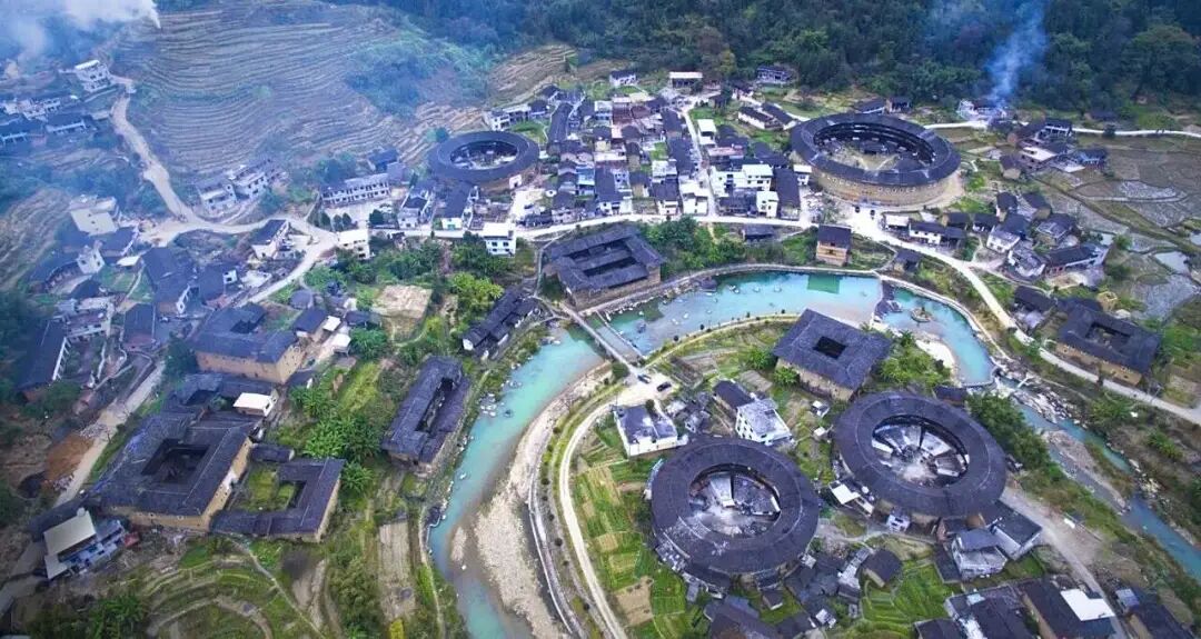 田螺坑村以土楼群闻名,由1座方形、3座圆形和1座椭圆形土楼组成。五座土楼依山势错落分布,在群山环抱中,居高俯瞰如盛开的梅花,又似从天而降的飞碟,人文造艺与自然环境完美融合,被誉为民居建筑中的奇葩,当地人戏称其为“四菜一汤”,视觉冲击强烈,令人叹为观止。