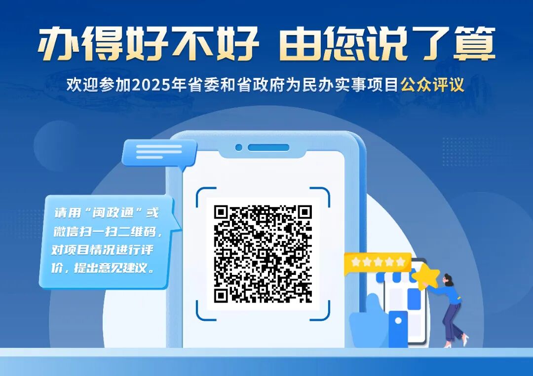 在为民办实事项目所在地张贴活动海报,引导群众通过“闽政通”或者微信扫描海报上的“民生实事码”,即可参加评议活动,反映问题、提出建议,也可通过省政府门户网站、微信公众号等进入活动页面进行评议。