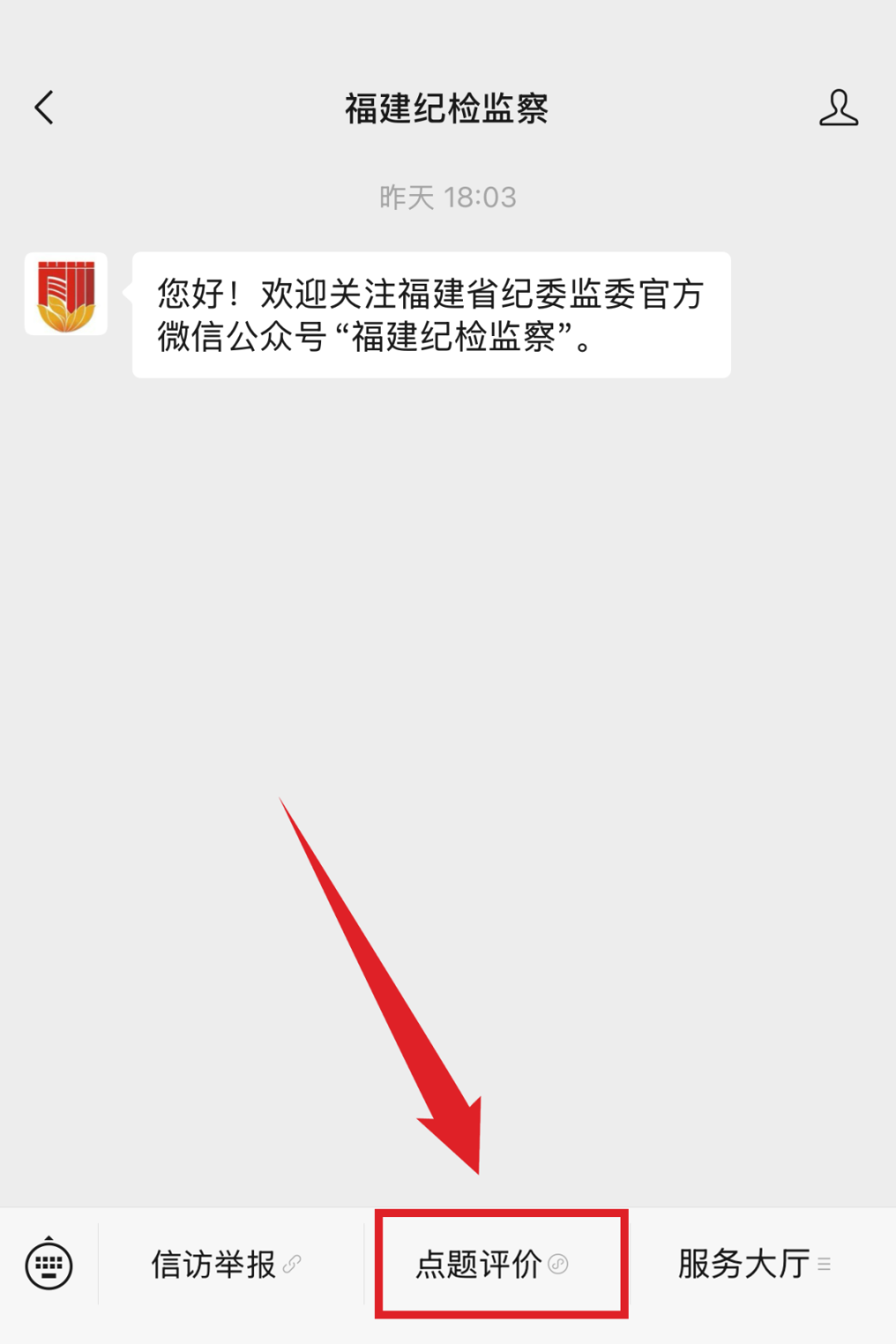 2、长按识别下方二维码,关注“福建纪检监察”微信公众号,在主页面下方菜单栏,参与“点题评价”