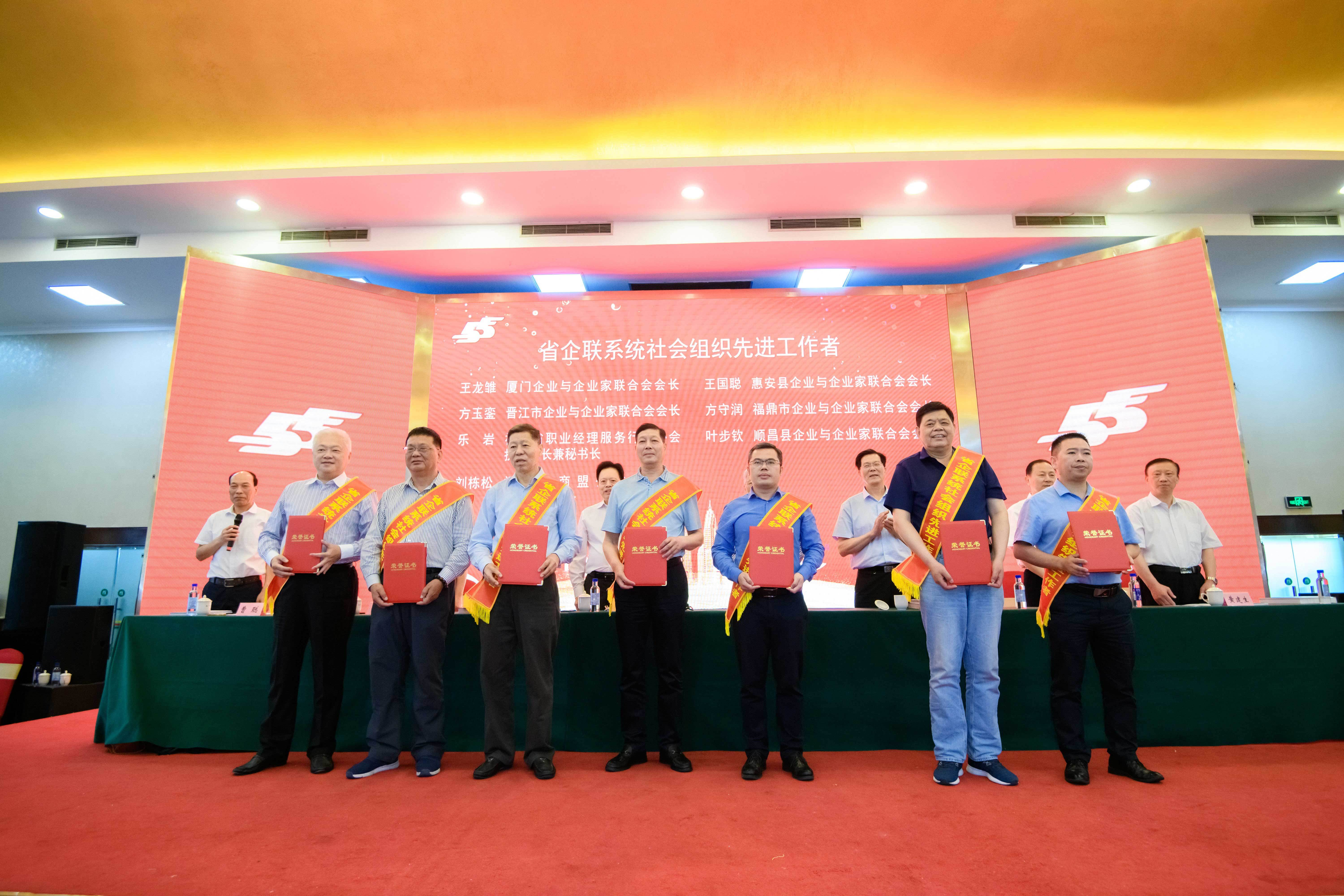 今年5月,乐岩(前右三)被评为福建省企业与企业家联合会系统社会组织先进工作者。供图/福建省职业经理服务行业协会