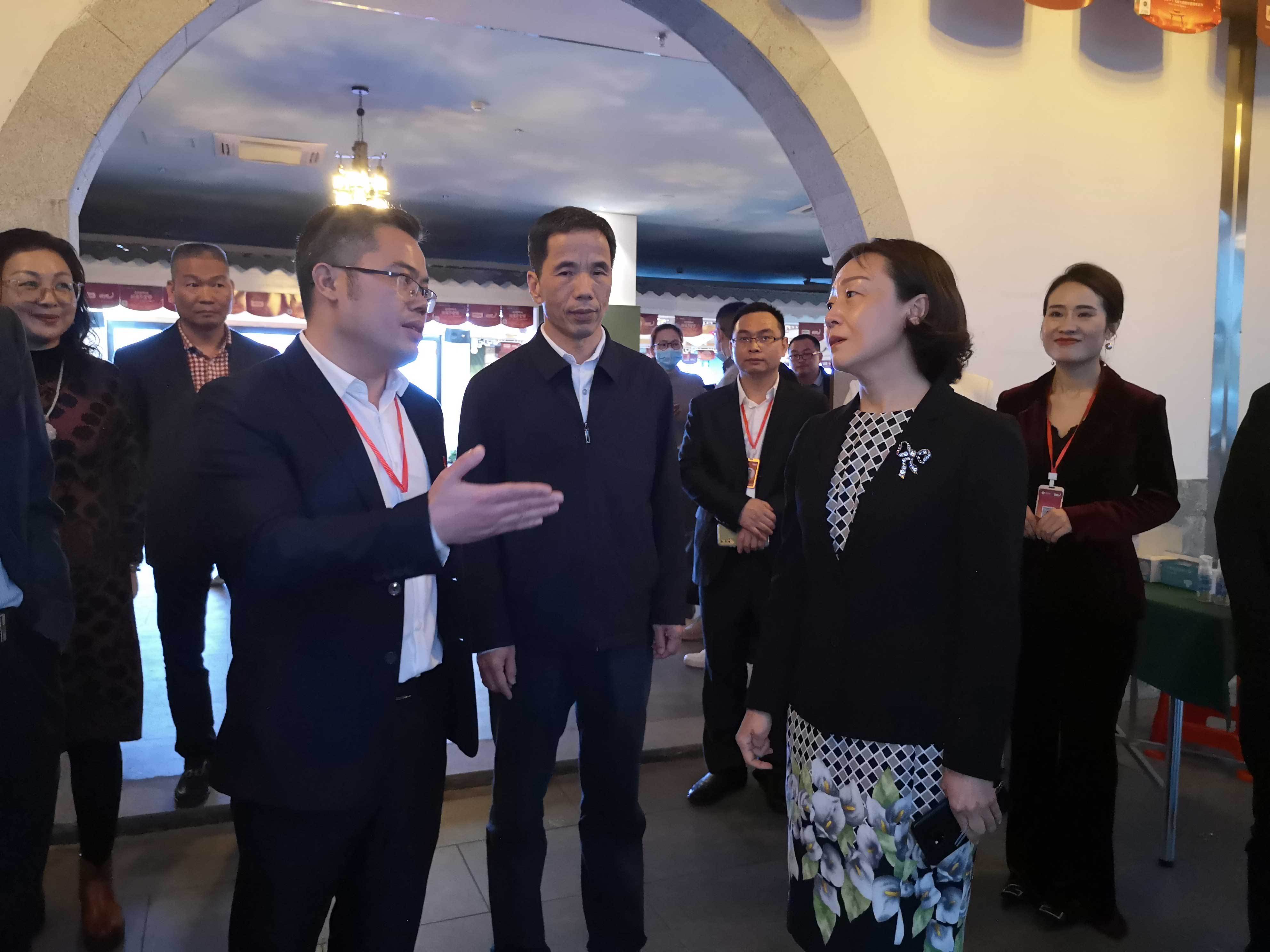 今年3月,乐岩向福建省副省长郭宁宁(右二)介绍“阳光1+1”助农产业馆工作。供图/福建省职业经理服务行业协会