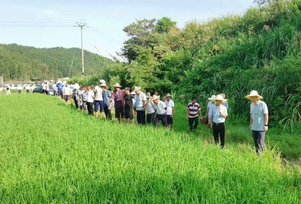 南平农科所高级农艺师刘龙钦在邵武河坊村福建省优质稻示范片现场教学