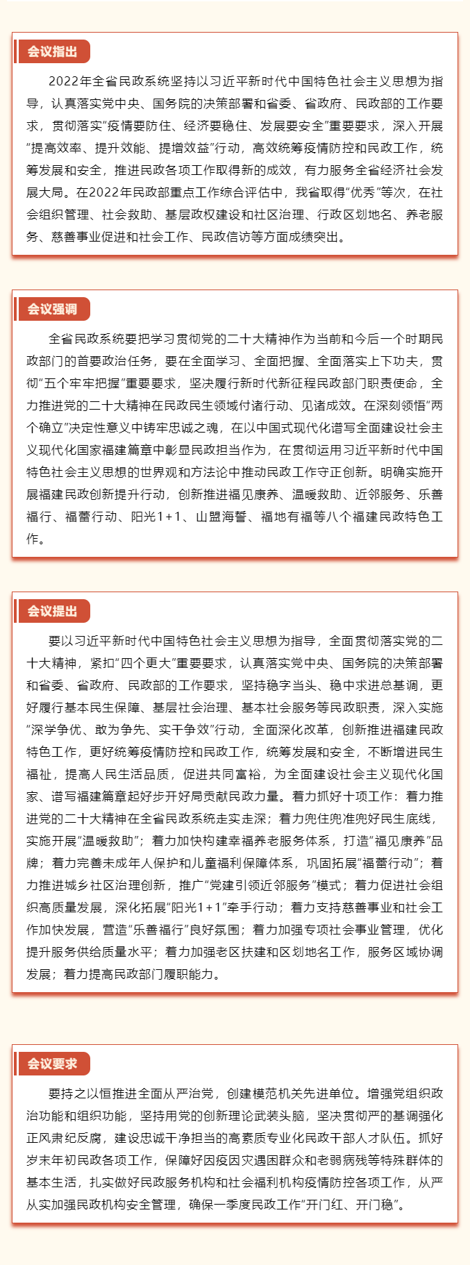 1月17日下午,全省民政工作会议在福州召开。会议深入学习贯彻党的二十大精神,认真贯彻落实中央经济工作会议、中央农村工作会议、全国民政工作会议精神和省委经济工作会议、省委农村工作会议、省“两会”部署要求,总结2022年工作,部署2023年工作。会议传达学习省委周祖翼书记、省政府赵龙省长、郑建闽副省长的批示精神,省主要领导和分管领导充分肯定2022年全省民政工作取得的成绩,对扎实做好今年民政各项工作提出明确要求。福建省民政厅党组书记、厅长程强作了总结部署讲话。会议由厅党组成员、副厅长赵荣生主持,厅党组成员、驻厅纪检监察组组长陈兆文,厅党组成员、副厅长陈丽华、林弘,厅二级巡视员出席会议。