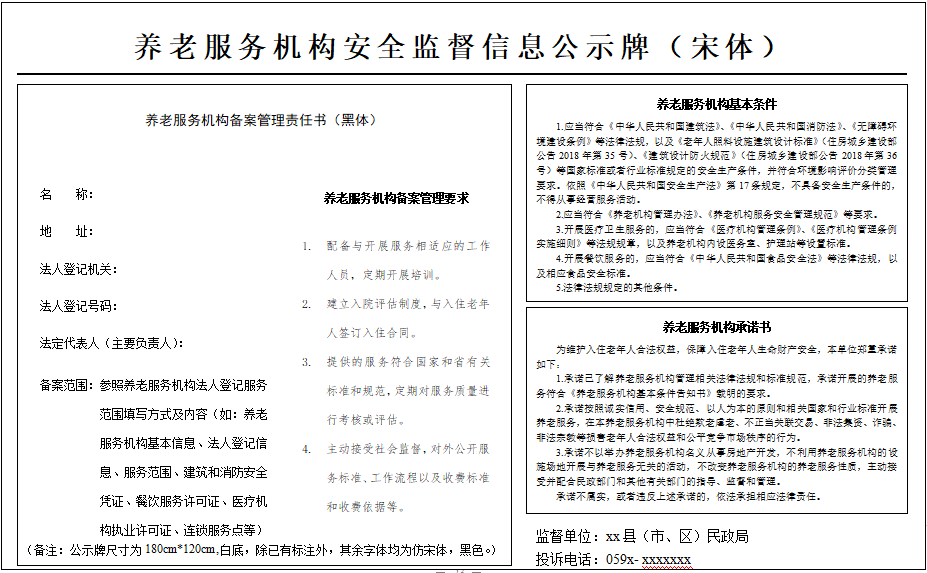 养老服务机构完成备案手续后,应在机构内设置《养老服务机构安全监督信息公示牌》(见附件8),并悬挂于显著位置。公示牌需载明养老服务机构基本信息、法人登记信息、备案范围、管理要求、养老服务机构基本条件、养老服务机构承诺,以及监督单位和投诉电话。