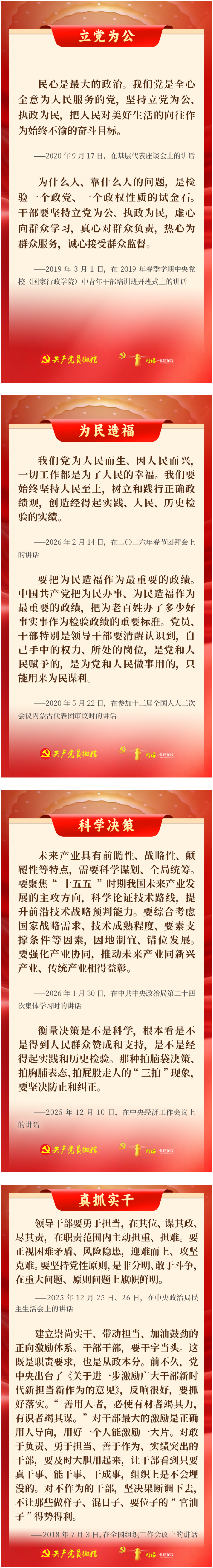 中共中央办公厅印发《关于在全党开展树立和践行正确政绩观学习教育的通知》,明确把“立党为公、为民造福、科学决策、真抓实干”这16个字,作为学习教育的总要求。“十五五”开局之年,一起学习总书记相关重要论述,将16字总要求内化于心、外化于行,树立和践行正确政绩观,投身强国建设、民族复兴的关键一程。