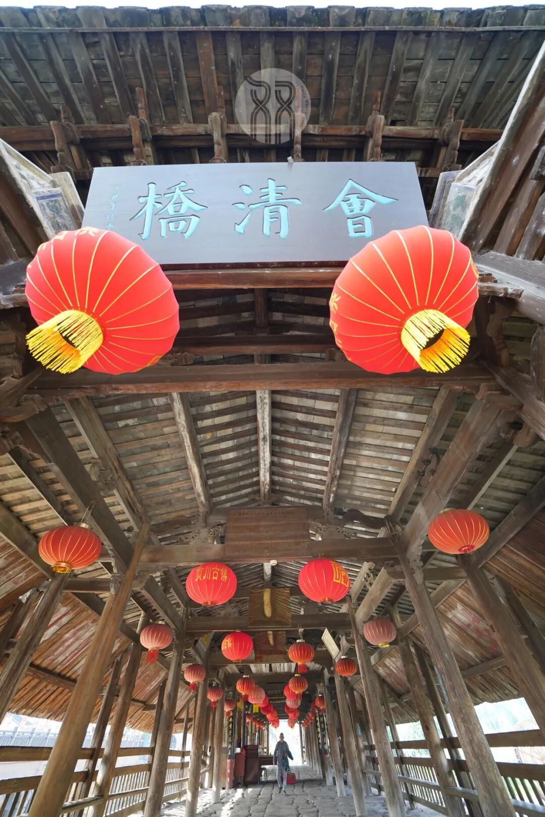 会清桥是贡川的标志性古建筑,集通行、风水、宗教祭祀等功能于一体。桥身始建于明成化乙巳年(1485年),南北走向,两墩三孔,长41米、宽7米、高8.1米,以丹霞石垒砌拱券,最大单拱跨度达13米,是福建省单拱跨度最长的古代廊桥。桥面廊屋建于清顺治元年(1644年),晚于桥身百余年。该桥坐落于胡贡溪与沙溪河交汇处,浊清两水在此交融,“会清”之名,或说取自迎接清朝,或说源于两河交汇之意。