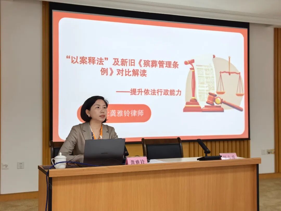 讲座中,龚雅铃律师围绕新《条例》的修订背景、主要变化及核心条款进行了系统解读,并结合数起典型的殡葬管理领域行政诉讼案例,深入剖析了行政行为在程序与实体上的合规性要点,以及新旧法规衔接过程中可能出现的风险点。通过对案例的细致讲解,清晰阐述了新形势下殡葬管理工作的法律边界、监管职责及规范要求,为民政干部提供了兼具理论深度与实践指导的专业分析。